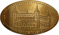 Pocas ciudades tienen tanta historia como Toledo, aunque en España estamos bien servidos de ciudades con historia, es una realidad que Toledo es especial, ciudad de las tres culturas (Cristiana, Judía y Musulmana) y ciudad imperial, ahora es también su casco histórico el único de España que tiene dedicadas tres máquinas de monedas elongadas. En esta entrada presentaré la primera de ellas, situada en una tienda de souvenirs de la calle Comercio. Se trata de una máquina con cuatro modelos distintos de elongated coins representando la Catedral, el Alcazar, la puerta de Bisagra y una escena de Don Quijote, la primera de ellas en formato vertical y las otras tres horizontales, todas con una orla de puntos rodeando el motivo principal. En todas ellas, figura también la leyenda añadida "Rdo. de Toledo".