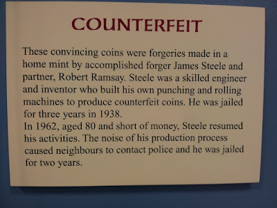 En la descripción de esta vitrina indican lo siguiente: "FALSIFICACIÓN - Estas convincentes monedas son falsificaciones realizadas en una ceca casera por el consumado falsificador James Steele y su socio, Robert Ramsay. Steele era un experto ingeniero e inventor que construyo su propia